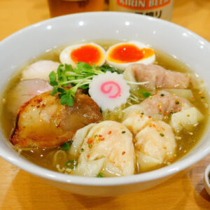 厳選された素材から仕込みに至るまで、店主が丁寧に手掛ける洗練された一杯。香り高い椎茸出汁をベースに、魚介の旨みが深く絡み合ったスープに、手包みのワンタンを添えて、食通を魅了します。