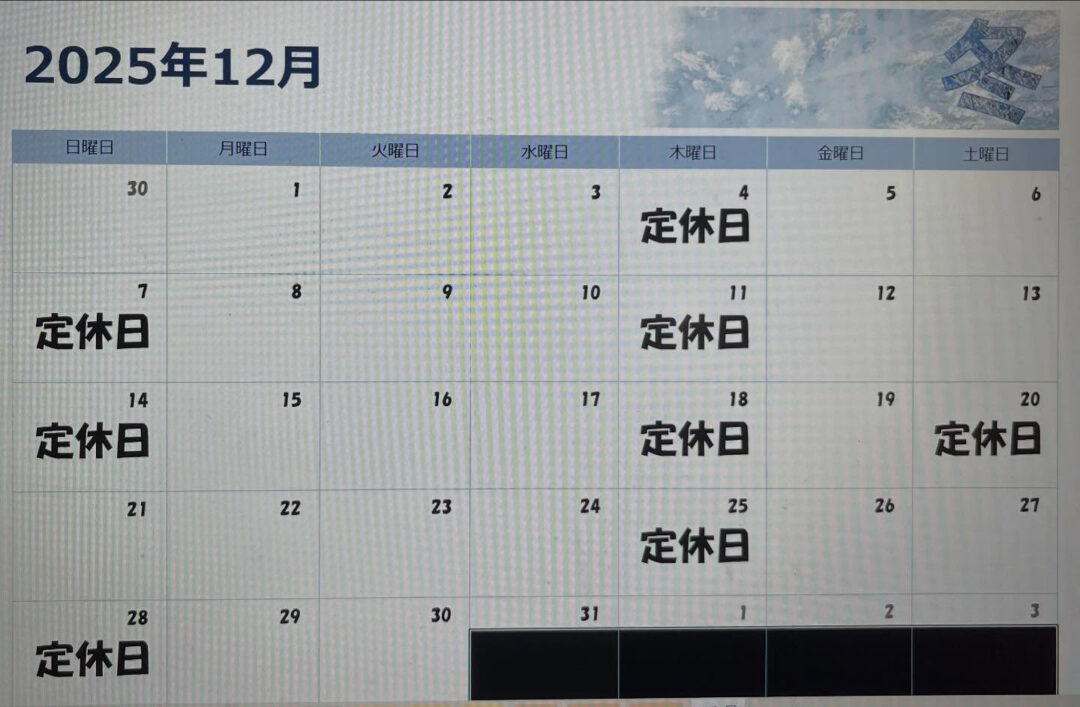 毎度ご来店有難うございます! 毎度ご来店有難うございます! 12月の営業スケジュールのお知らせです! 本日は定休日となりますが12月から女将ゆきこが復帰しております! よろしくお願いいたします スキル 投稿日 2025年12月4日 ← 毎度ご来店有難うございます! 毎度ご来店ありがとうございます‼️ →